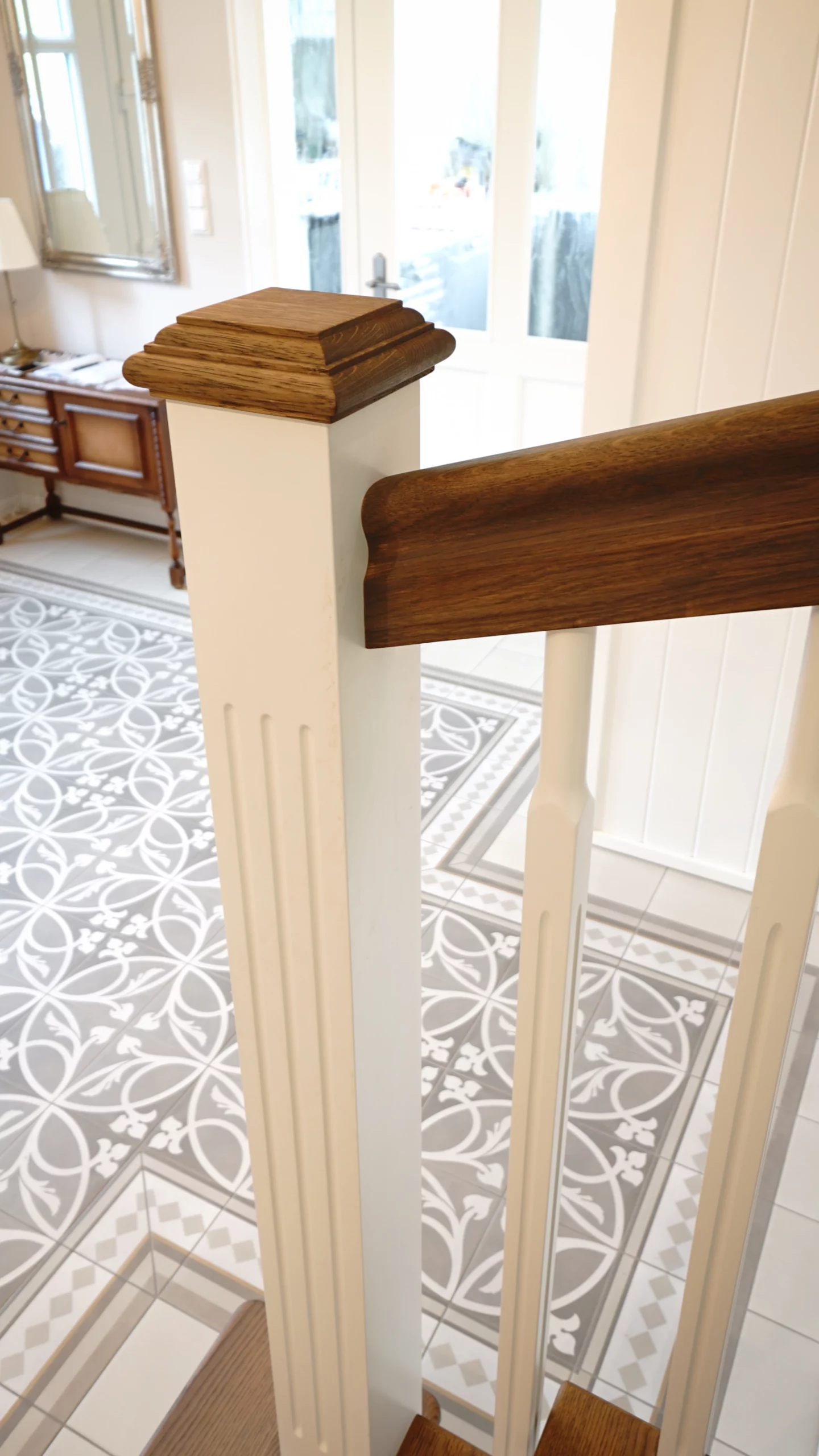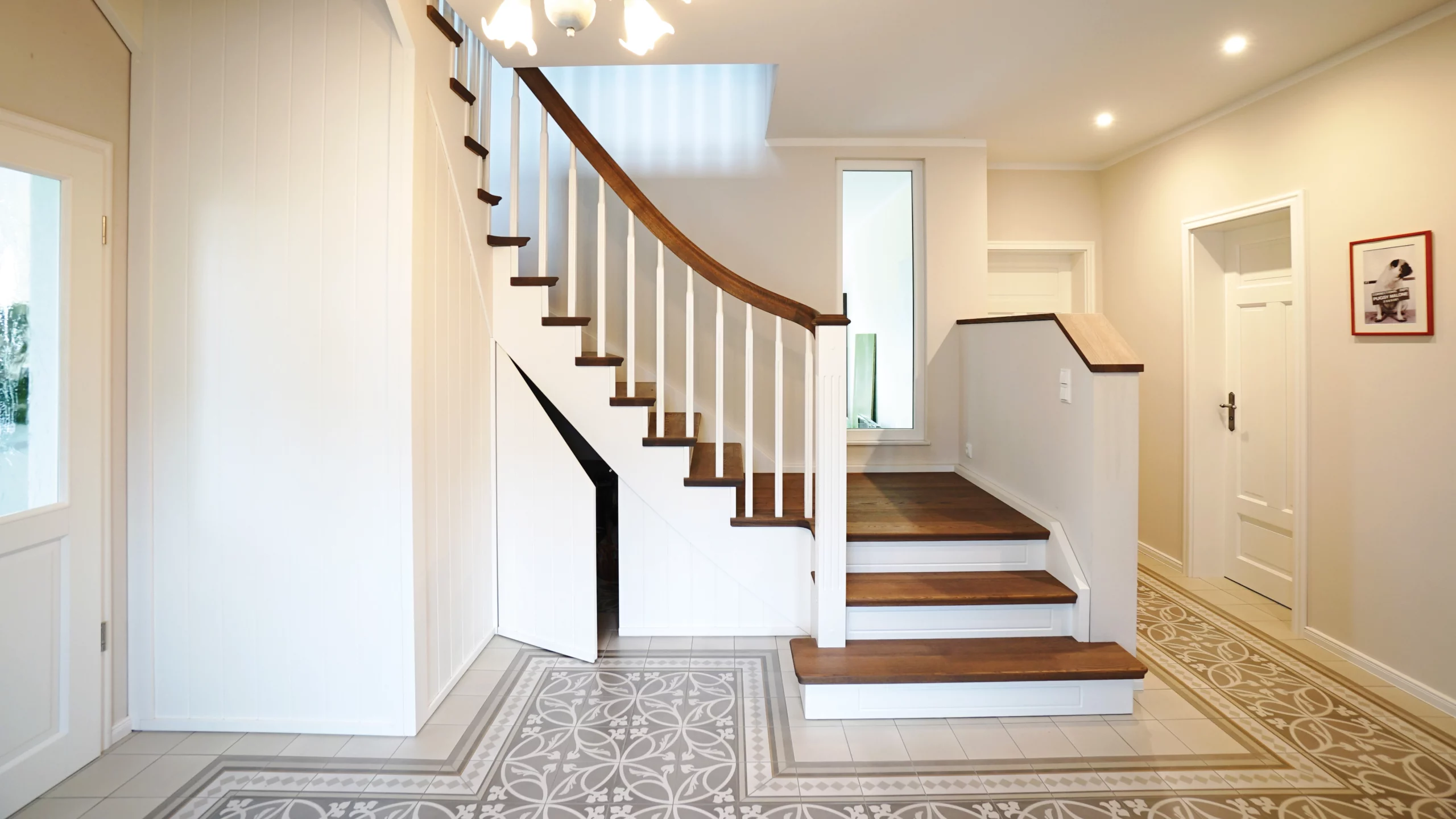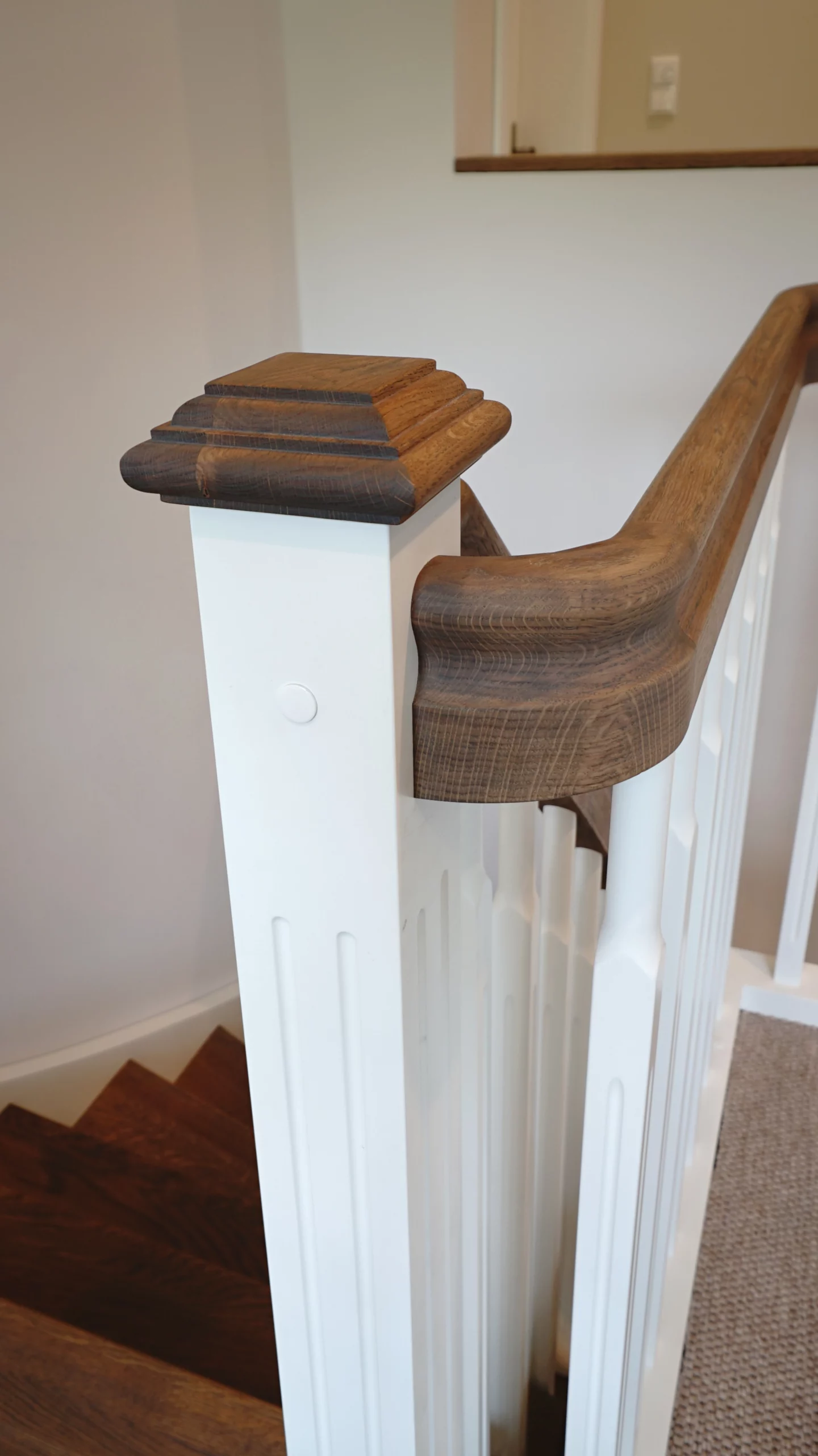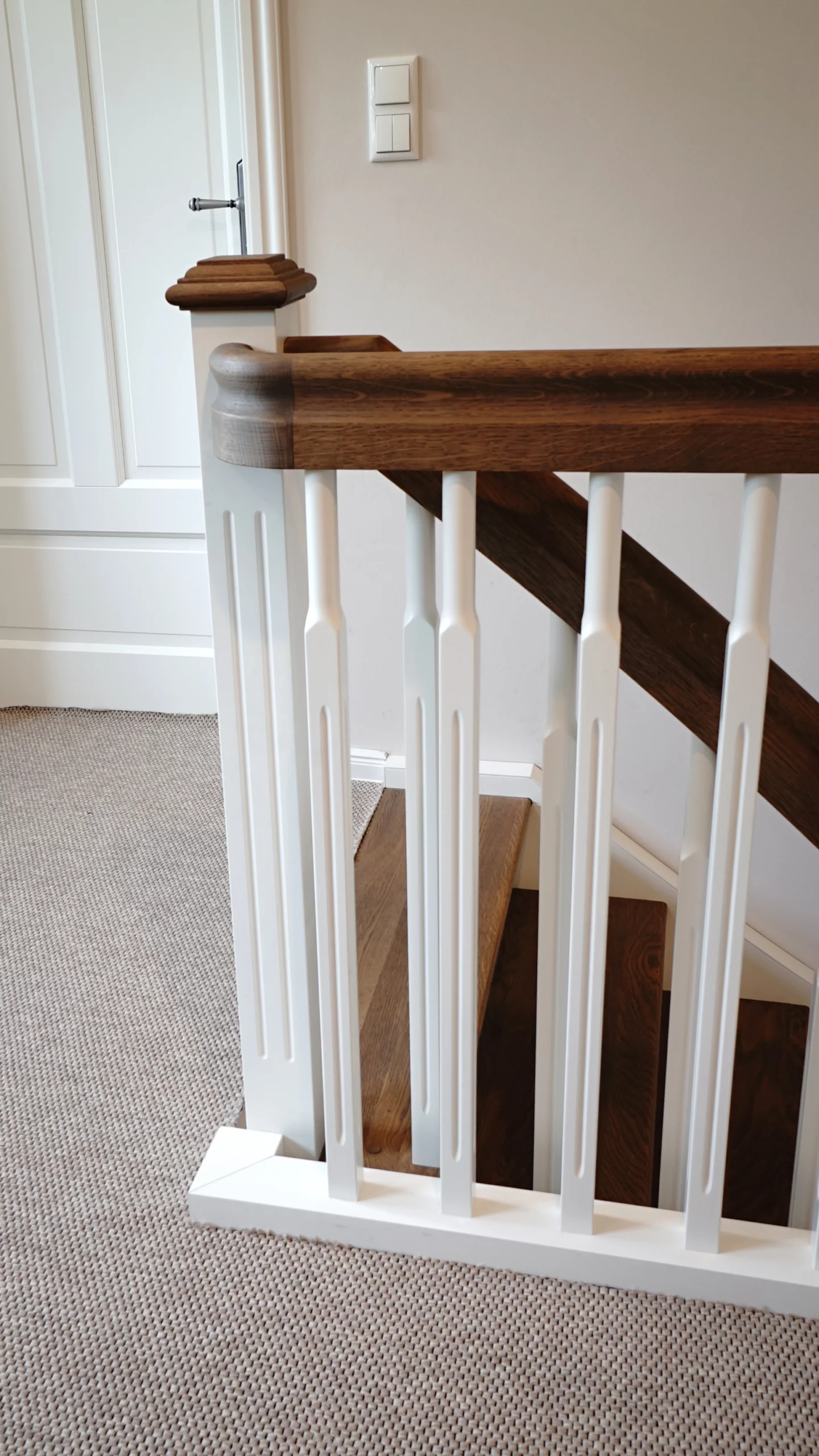 Stauraumtreppe Basic - Eiche durchgehend verleimt, farblich geölt, teilweise weiß lackiert, Pfosten P9 und P15, Sprosse W18, Handlauf HW2, Stufenprofil SP2, Eckpodest, Setzstufen mit eingefrästen Kassetten, raumseitig aufgesattelt, Handlaufkrümmling, Blockstufe, Unterbau mit Möbeltür, Pushbeschläge, Brettoptik